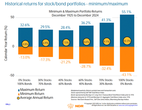 Take a look at the graphic below that shows various compositions of stock/bond portfolios, along with some important high-level risk and return attributes: