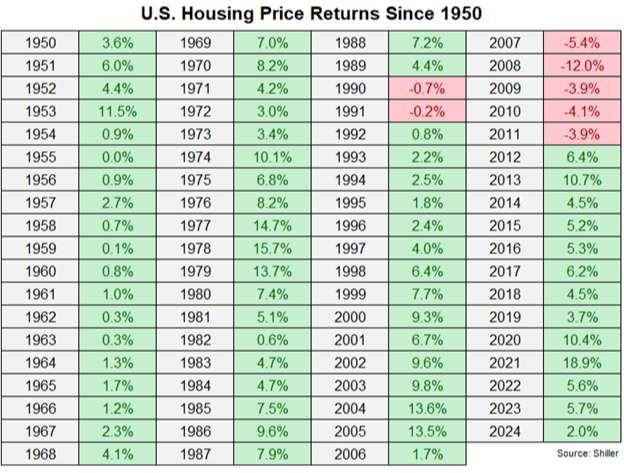 A closer look at this chart shows that only seven years out of 75 were housing negative. That means housing prices were negative only 9% of the time!